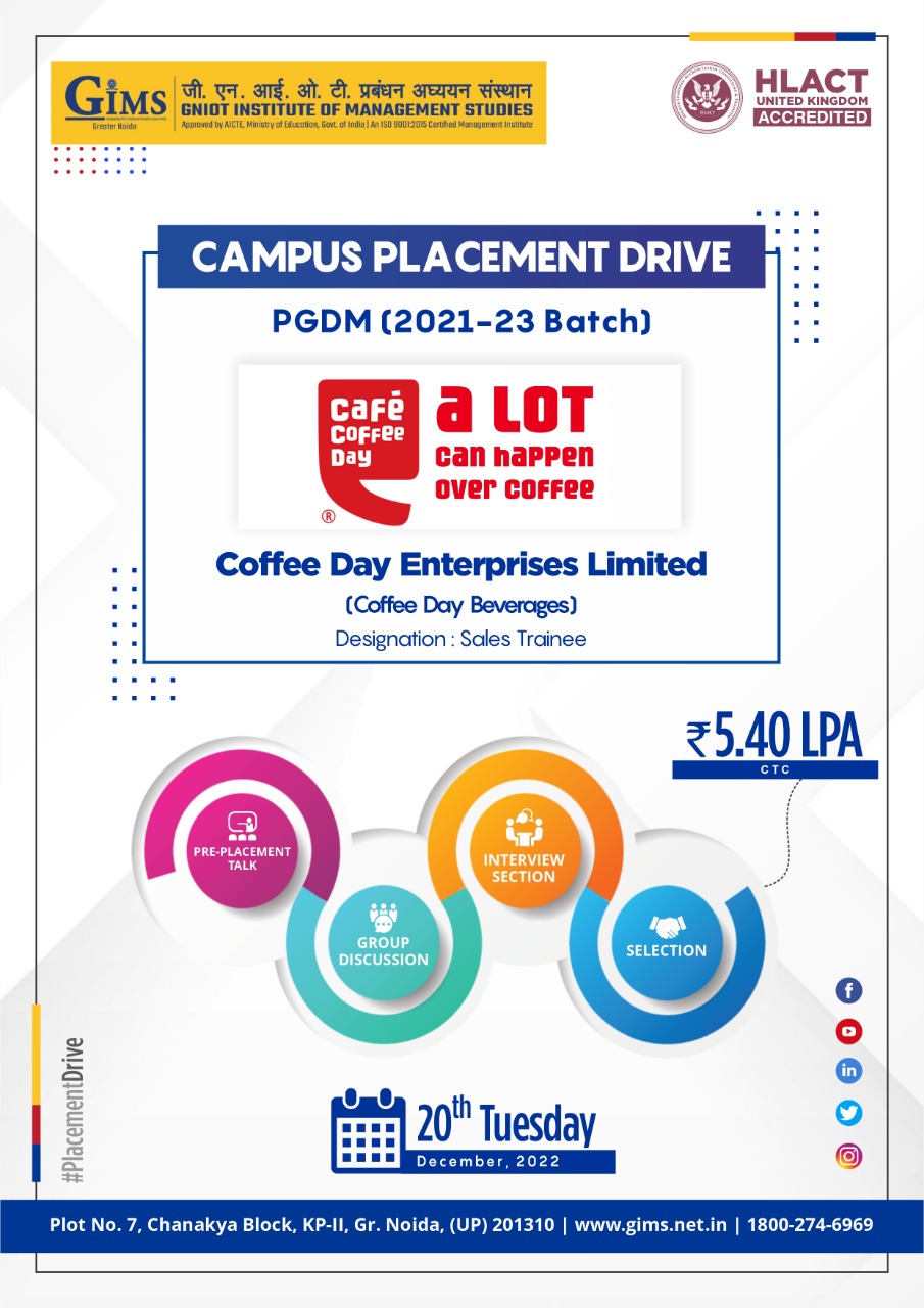 GNIOT Institute of Management Studies (GIMS), Greater Noida, welcomes Coffee Day Enterprises Ltd. for the Campus Placement Drive on 20th December 2022 for PGDM (2021-23 Batch).