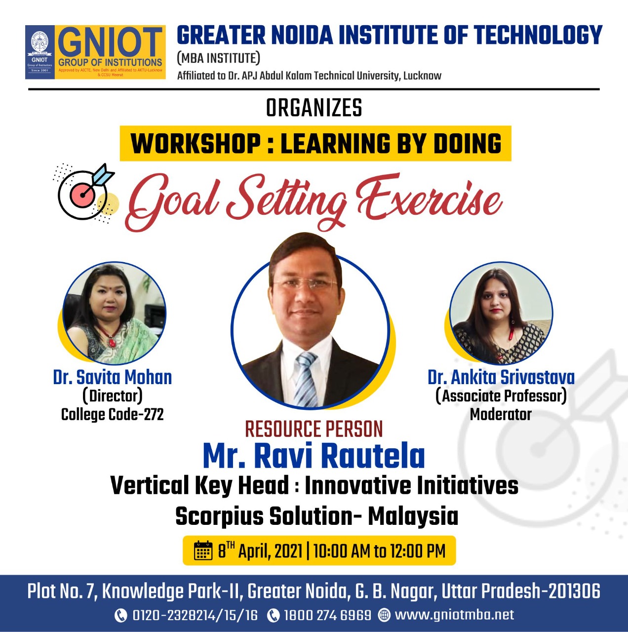 For encouraging the students towards their goal, Greater Noida Institute of Technology – MBA Institute is organizing a workshop on “ Goal Setting Exercise” . The aim of the workshop is to motivate the students for making their vision as well as make them focused towards acquisition of knowledge & organization of time and resources so that they can make the most of their life.