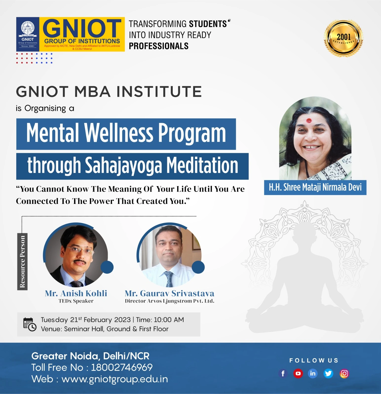 GNIOT MBA INSTITUTE is organizing a Mental Wellness Program on 21/02/23 for the students and Faculty members under the guidance of our Honourable Director Sir, Prof (Dr) D B Singh. Sahajayoga Meditation has proven benefits for physical and mental agonies. A pure scientific and spiritual blend in the form of meditation for creating better lives, the initiative is sure to benefit students and Faculty alike.
