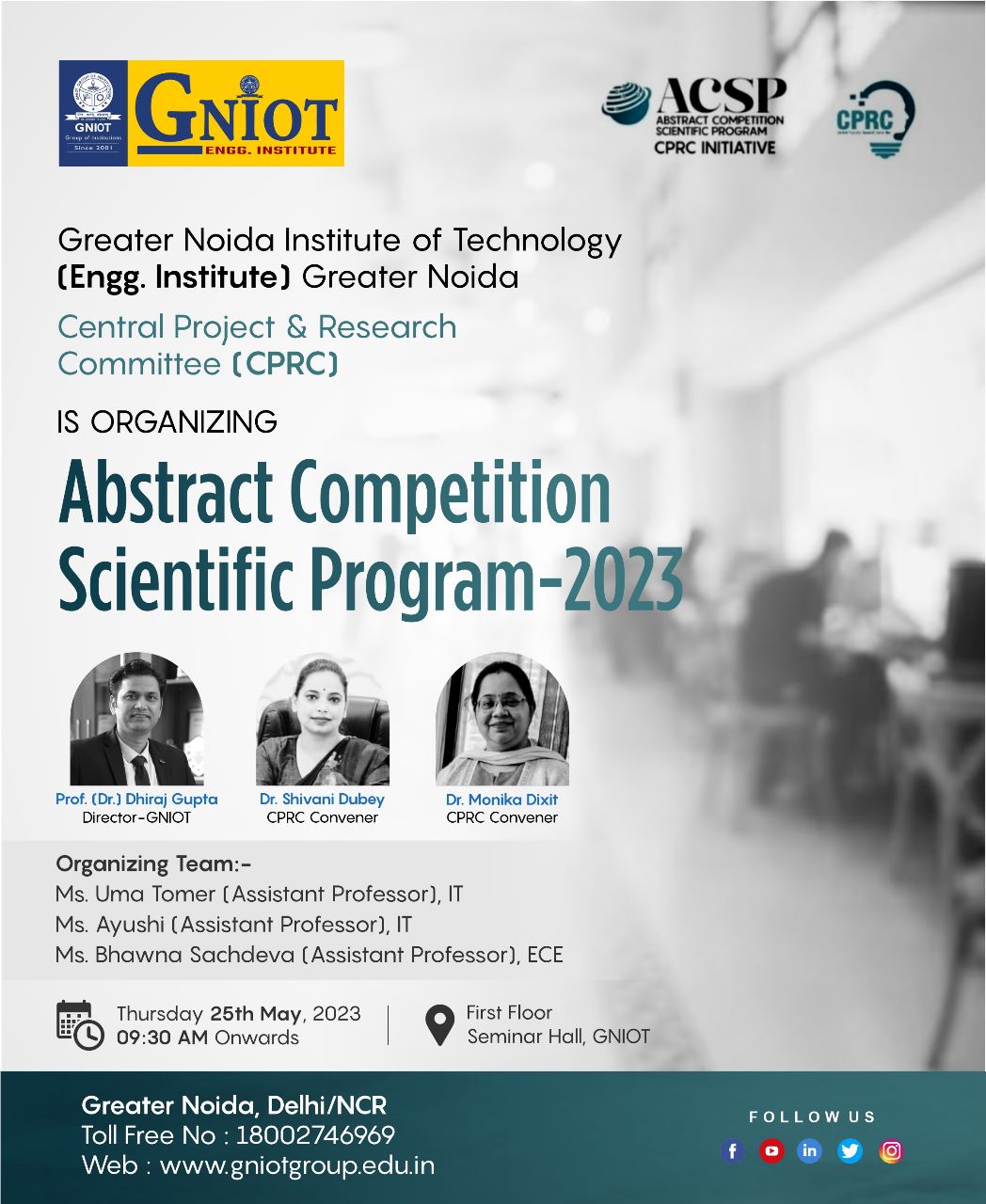 Central Project & Research Committee (CPRC) happily announce the Abstract Competition Scientific Program (ACSP) 2023 for B.Tech, M.Tech & MCA students at institute level on 25th May, 2023, 09:30 AM onwards. The motive of this program is, to develop, creative and scientific approach among the students. This event may extend support and create the research environment for project development in innovative ways. In this program, student will get an opportunity to present their unique Scientific & Technical Research idea's in the form of abstract for which the extended version may be submitted as a research paper/article in National or International level Conferences/Journal or may be published as patent.