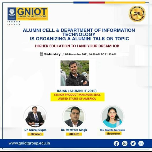 GNIOT Alumni Cell and Department of Information Technology is going to organize an Alumni Talk on the topic "Higher Education to Land Your Dream Job" on 11th December, 2021 between 10:30 AM to 11:30 AM IST.