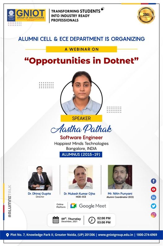 Department of Electronics and Communication under the aegis of Alumni Cell,GNIOT is organizing an online alumni talk on Thursday 9 December, 2021. The key speaker of webinar is Ms. Aastha Pathak (Software Engineer , Happiest Minds Technology, Bangalore) alumnus of ECE-Batch-(2015-2019) will deliver a talk on "Opportunities in Dotnet" for ECE students through Google meet from 2-3 pm.