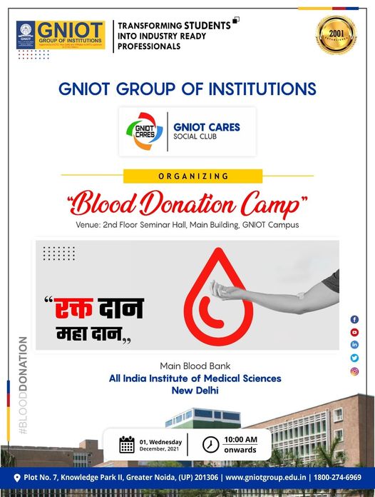 GNIOT Cares Social Club is Organizing "Blood Donation Camp" Today, Venue: 2nd Floor Seminar Hall, Main Building, Gniot Campus.