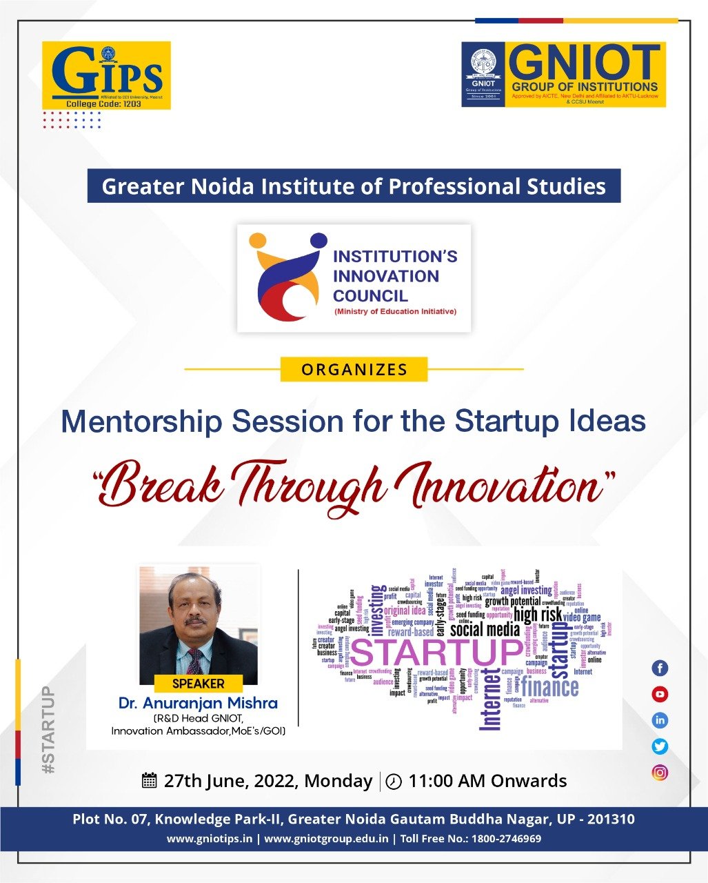 With this vision, the Greater Noida Institute of Professional Studies under the observation of the Institution’s Innovation Council (IIC) organizes a mentorship session for the startup Idea “ Break Through Innovation.” This session will be steered by our prominent Brand Ambassador of IIC Dr. Anuranjan Mishra (R&D head GNIOT, Innovation Ambassador MoE, GOI).