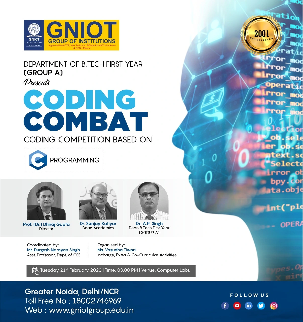 To enhance the cognitive and technical skills of the students, the Department of B.Tech First Year is organizing a Coding Competition called " Coding Combat" based on C programming. The details of the event are mentioned below.