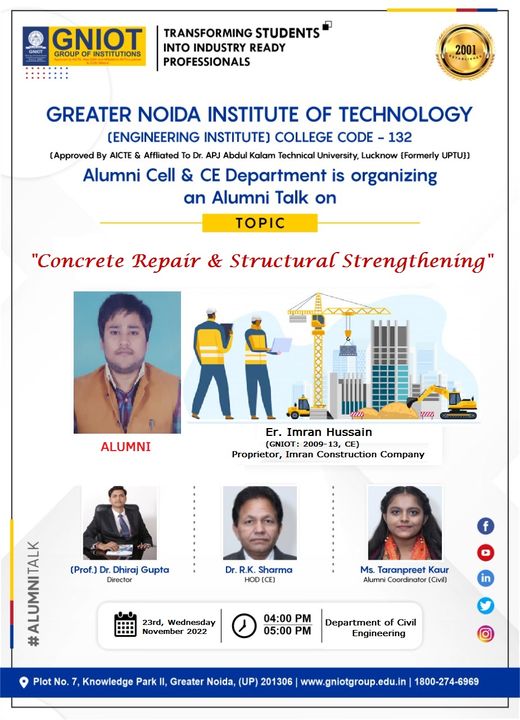 Civil Department and Alumni Cell is going to organize an Alumni talk under the aegis of GNIOT, Greater Noida on the topic "Concrete Repair & Structural Strengthening" on 23rd November, 2022 from 4 PM to 5 PM.