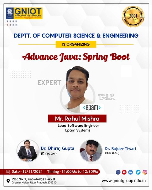 Java has a vivid ecosystem having huge number of libraries and frameworks such as Hibernate, Spring, Spring Boot etc. to build range of applications starting from cloud computing, E-Commerce, finance, banking, web applications and many more. Keeping this in view Department of Computer Science & Engineering is organizing an expert talk on ADVANCE JAVA: Spring Boot on 12/11/2021 from 11:00am to 12:30 pm.