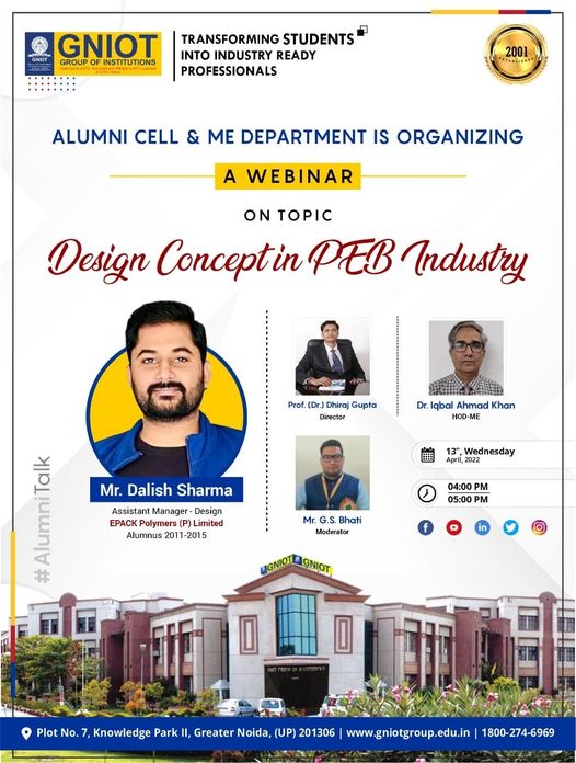 Mr. Dalish Sharma, an alumnus of GNIOT (pass out Batch of 2015) will be speaker of the event. You are all cordially invited to join the webinar on *13/04/2021 at 4:00 PM