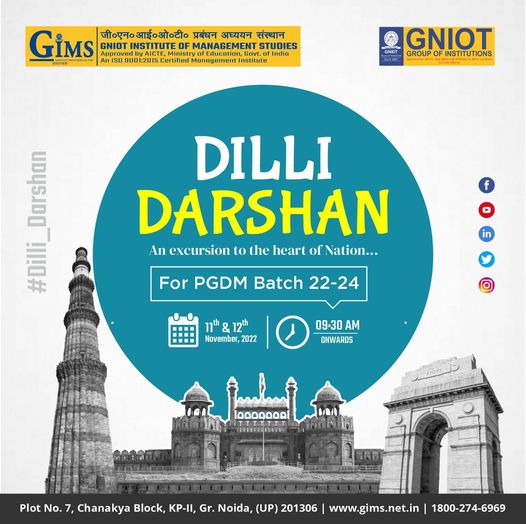 Keeping the same objective in mind, GNIOT Institute of Management Studies (GIMS), Greater Noida has organized Dilli Darshan - An Excursion to the Heart of Nation on November 11 and 12, 2022.