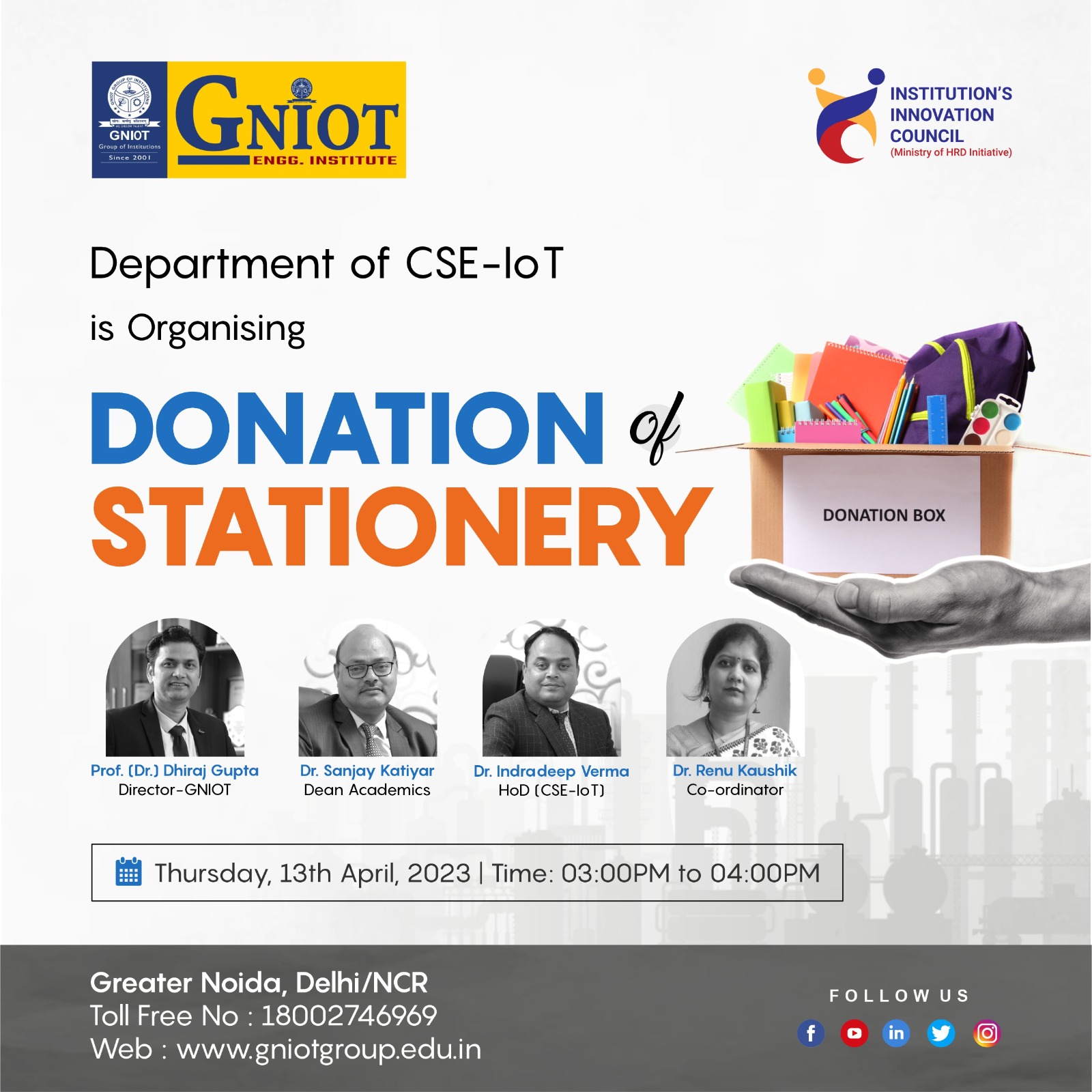 Department of CSE-IoT is going to conduct "Stationary donation" event on 13th April, 2023 from 3:00 PM to 4:00 PM. The objective is to distribute stationary to children in order to assure that each and every child from poor background must have the basic study materials which will help them making their future bright . Coordinator of the event is Dr.Renu Kaushik.A special thanks to Prof.(Dr.) Dhiraj Gupta (Director, GNIOT-132),Prof.(Dr.) Sanjay Katiyar (Dean Academics, GNIOT) and Prof.(Dr.)Indradeep Verma (HOD, CSE-IoT, GNIOT) for their continuous support and motivation.