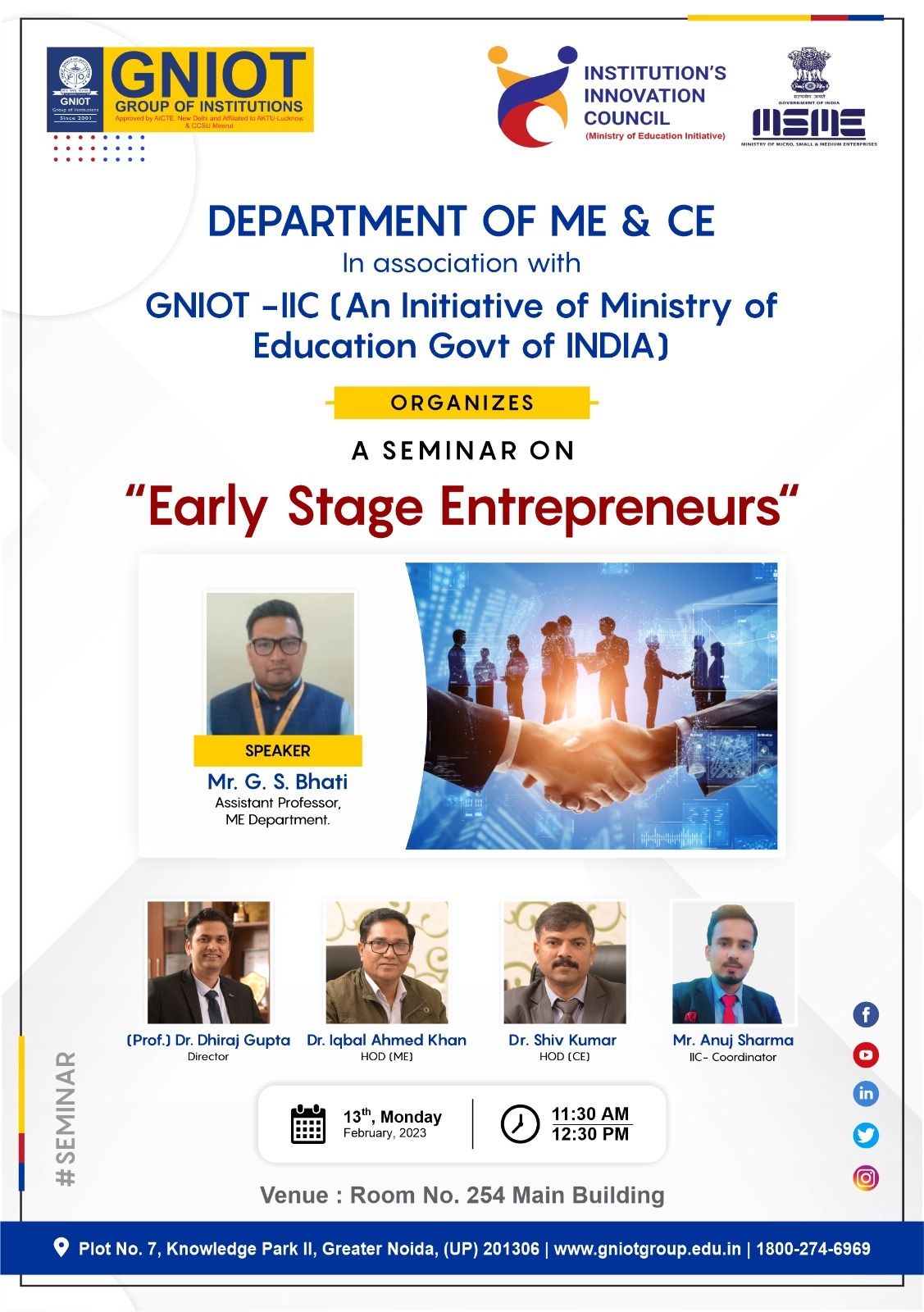 Department of Mechanical Engineering and Civil Engineering is going to organise a Seminar entitled “Early Stage Entrepreneurs” under the aegis of Institution’s innovative council (IIC). This Seminar aims to clarify some basic tenets of entrepreneurship in education, focusing on what it is, why it is relevant to society when it is applied, and how to use in practice in the early stages. The intended audience of this seminar will be able to understand how to start their own business and become entrepreneur. It also clarify primarily of existing research in the domains of entrepreneurship, education, psychology and philosophy. Where the research is scarce the speaker will give important guidance and direction based on conducted research and innovation as well as policies of central and state governments.