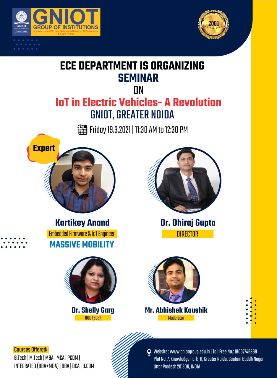 Electric vehicles are an important step towards the goal of achieving 100% clean energy and zero emissions. The vehicle transport system is rapidly increasing towards a sustainable electric vehicle population. Cloud-based monitoring and management of the smart charger station for electric vehicles (EVs) for the security-driven IoT enabled direct current (DC) fast chargers is an important aspect in EVs. Keeping in view the importance and need of this emerging topic an interactive seminar is being organized by department of Electronics and communication engineering with Industry Expert.