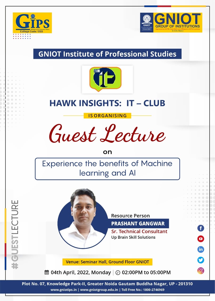 HAWK INSIGHTS the IT Club of Greater Noida Institute of Professional Studies is organizing a Guest Lecture for BCA students on the topic “Experience the benefits of Machine Learning and Artificial Intelligence”. The Resource Person of the event is Mr. Prashant Gangwar (Senior Technical Consultant) of UpBrain Skill Solution, New Delhi. Our resource person has delivered more than 200 IBM Training under IBM Career Education Program pan India. He has also delivered more than 5000 Trainings in PYTHON, Machine Learning, Data Science and Artificial Intelligence.