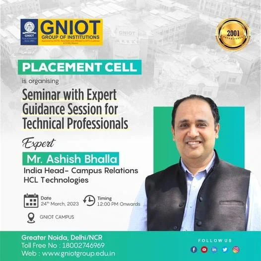 GNIOT GROUP OF INSTITUTIONS is delighted to extend an invitation to Mr. Ashish Bhalla (India Head- Campus Relations), a respected guest, to grace our institution with their presence and share valuable insights on an EXPERT GUIDANCE SESSION FOR TECHNICAL PROFESSIONALS. Our students are eagerly anticipating this opportunity to learn from a seasoned leadership expert like Mr. Bhalla.