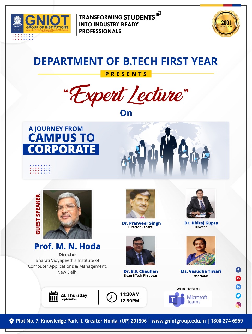 The session " A Journey from Campus to Corporate", is an enlightening talk with the fresher students of GNIOT to become efficient through learning the basics of corporate communication and mindset shift that is necessary while moving from campus culture to corporate world. Fresher students will get a boost in their confidence, goal setting, team work and managing stress.