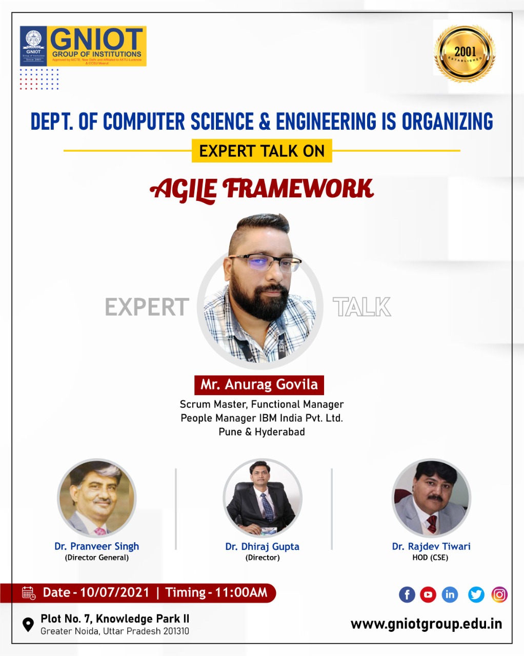 Keeping ourselves upgraded as per the industry requirements is probably a challenge which every IT professionals face very often. Upgradation becomes more important if you are targeting a job or project. To make our students upgraded and industry ready department of Computer Science and Engineering at GNIOT, continuously brings various relevant events on board. In this sequence we are organizing expert talk on Agile Framework for our students on 10th July. The talk will be delivered by the expert Mr Anurag Govila from IBM.