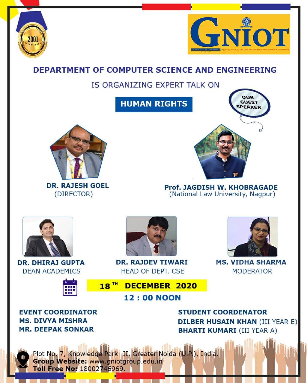 Human rights day is celebrated every year on 10th December. Human right is something for which everyone is entitled as human being regardless of colour, religion, sex, language, opinion, social status etc. Taking it as a social responsibility, department of Computer Science & Engineering is organizing an expert talk on Human Rights to sensitize our students towards the human rights.