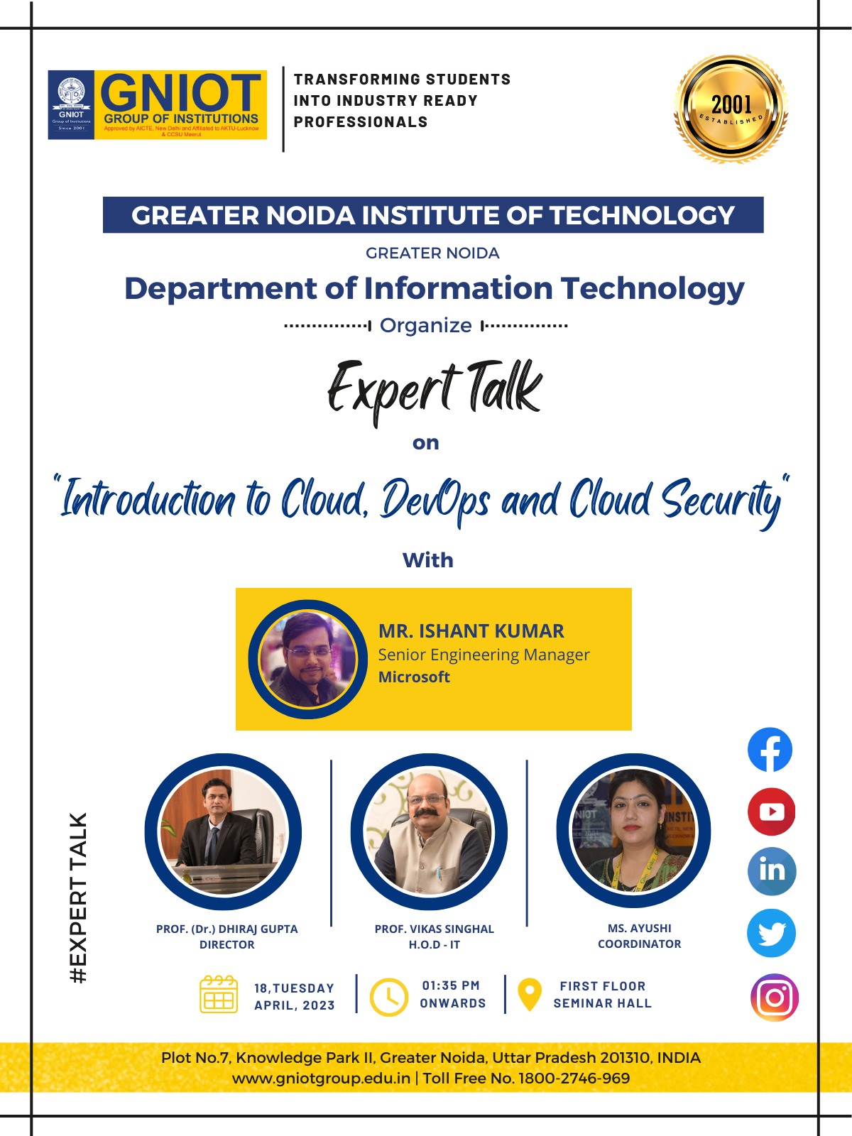 Department of Information Technology is organizing an Expert Talk on Introduction to Cloud, DevOps and Cloud Security. This will be on 18th April 2023 from 01:35 PM onwards in the first-floor seminar hall. This session is held with 2nd and 3rd year students in mind just so they benefit from the knowledge of experts. The Expert of the event is Mr. Ishant Kumar, Senior Engineering Manager - SRE at Microsoft | Ex-Adobe*. Mr. Ishant is expert in aws, azure, devops, cloudcomputing, and sitereliabilityengineering
