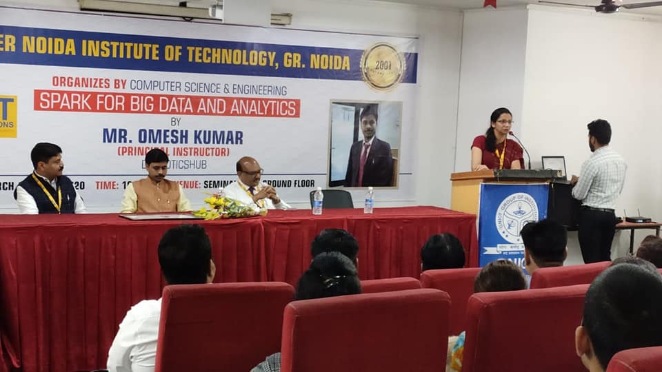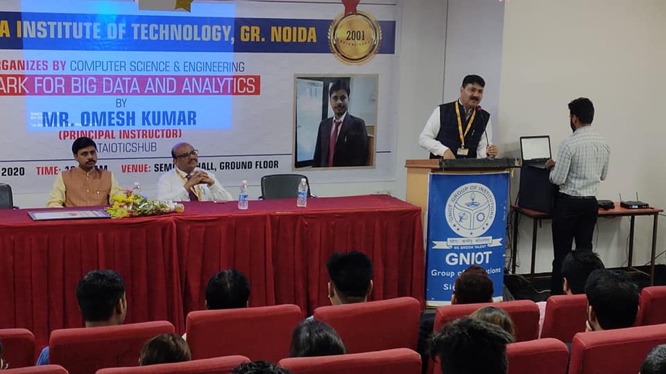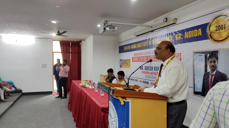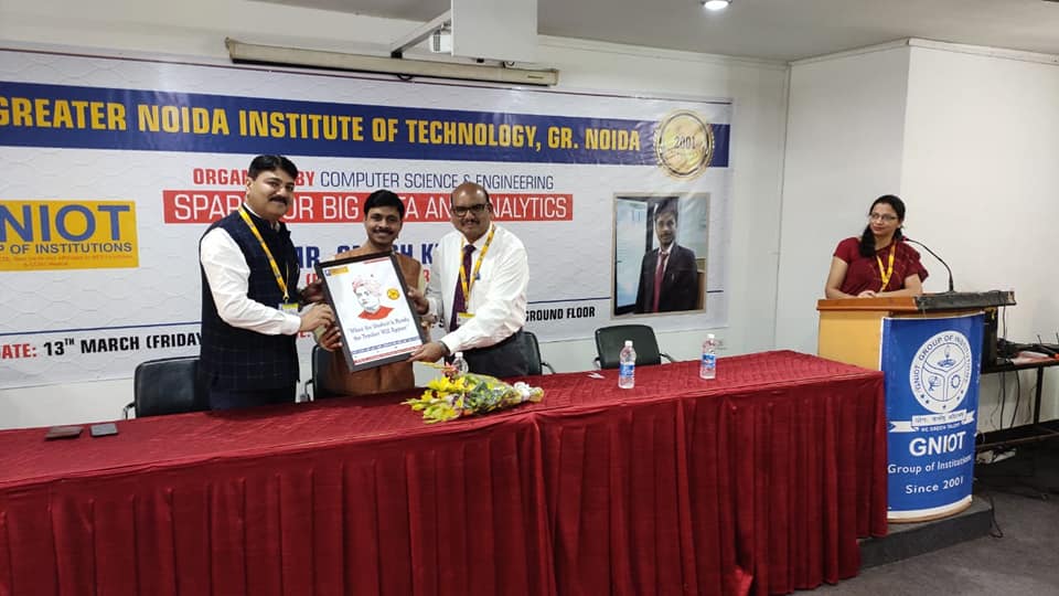 Department of Computer Science , GNIOT organized an expert talk on " Spark for Big Data and Analytics" on 13th March 2020. Dr Rajdev Tiwari introduced the topic of the talked in the beginning of the event. Director, Dr Rajesh Goel welcomed the expert and encouraged the students for their active participation through his informative speech. Big Data expert Mr Omesh Kumar from DataioticsHub delivered a talk on Big Data and Analytics using Spark. Event was attended by more than 150 students.