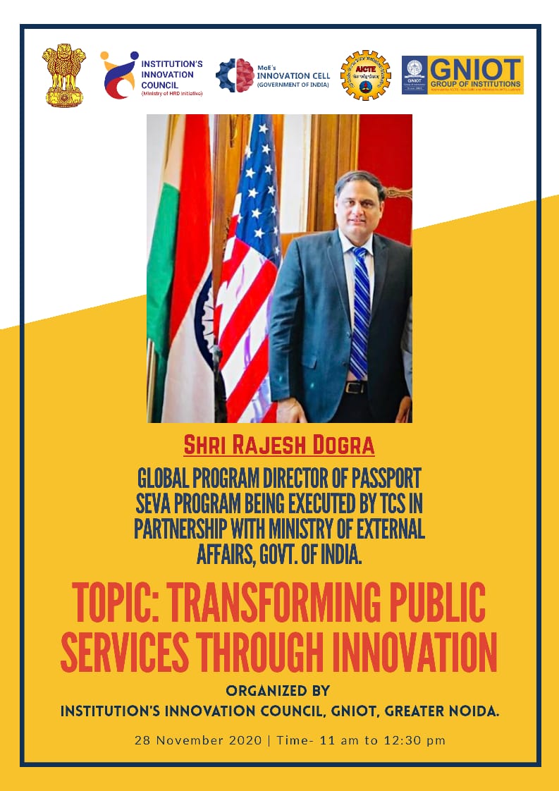 Institution’s Innovation Cell (an imitative of Ministry of Education, Govt. of India), GNIOT, Greater Noida Is organizing a Expert Talk on the Topic “Transforming Public Services through Innovation”by Mr. Rajesh Dogra, Global Program Director of Passport Seva Program being executed by TCS in partnership with Ministry of External Affairs, Govt. of India. On 28 November, 2020 at 11 AM.