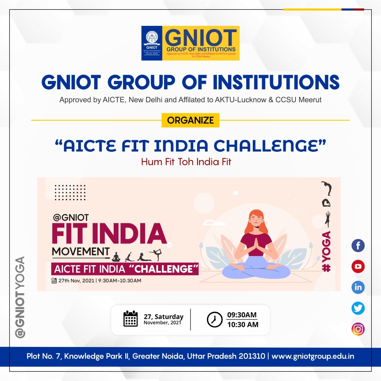 As righty said a fit mind resides in a fit body, keeping this in mind GNIOT MBA Institute feels privileged to organise “FIT INDIA CHALLENGE” for entire GNIOT group of Institutions under the aegis of AICTE on November 27,2021 09:30 a.m. onwards in campus premises. It is a across national campaign that targets and urges individuals to stress on physical exercises and sports for their regular daily existences. Fit India Movement was launched on 29th August, 2019 by Hon'ble Prime Minister with a view to make fitness an integral part of our daily lives. The mission of the Movement is to bring about behavioural changes and move towards a more physically active lifestyle.
