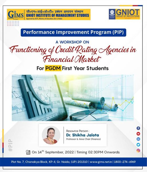 GIMS organize Performance Improvement Programs (PIP) A workshop on ‘Functioning of credit Rating Agencies in Financial Market’ will be held on 14th September, 2022.