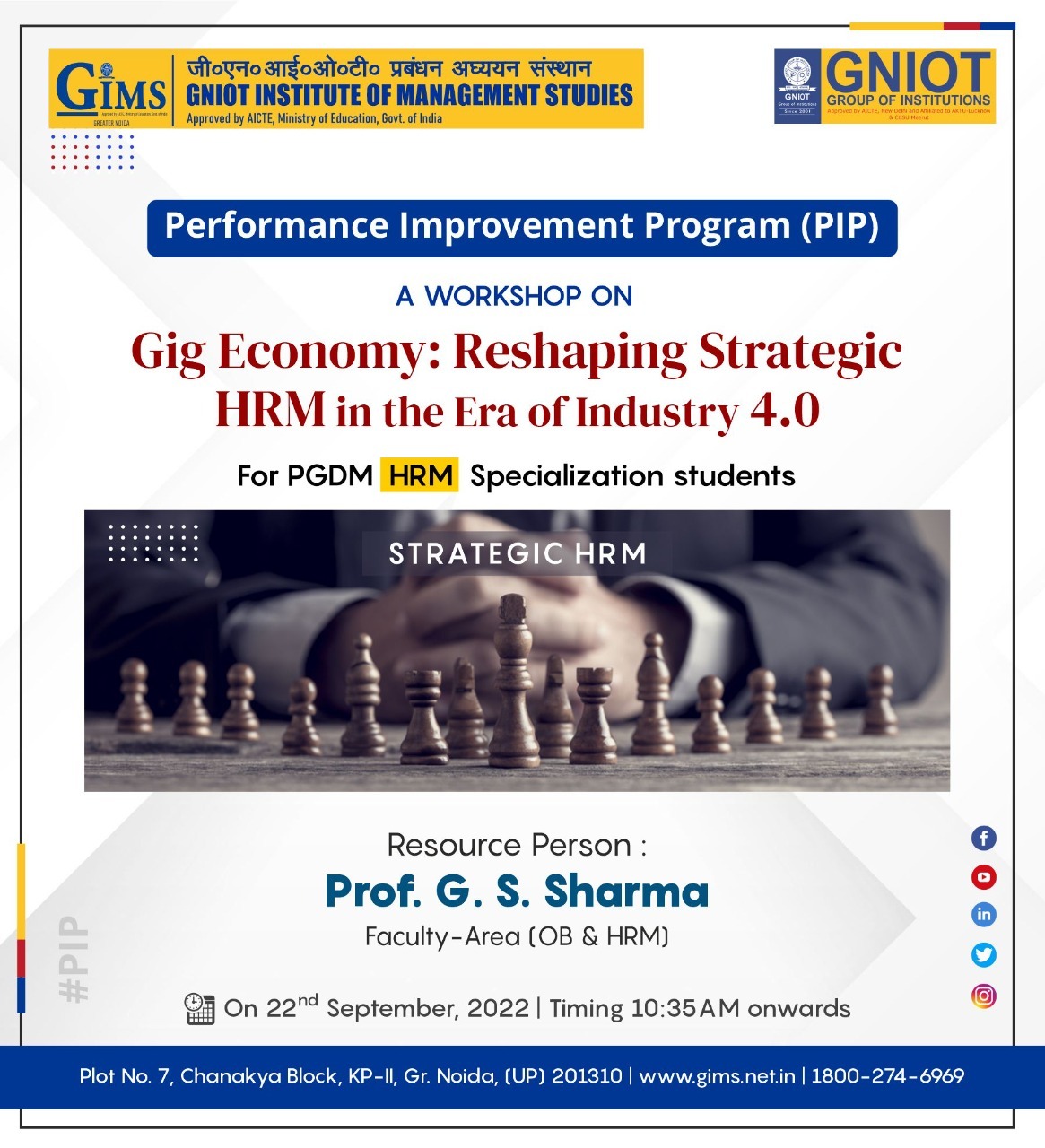 Under the banner of Performance Improvement Program (PIP) GNIOT Institute of Management Studies in organizing workshop on “Gig Economy: Reshaping Strategic HRM in the Era of Industry 4.0” on 22/09/2022 from 10:35 AM onwards. The facilitator of the session-Prof. G. S. Sharma (OB & HRM), will discuss the role of & function of Strategic Human Resource Management in managing employees at the era of Gig Economy where organizations focusing more on temporary & contractual employees.