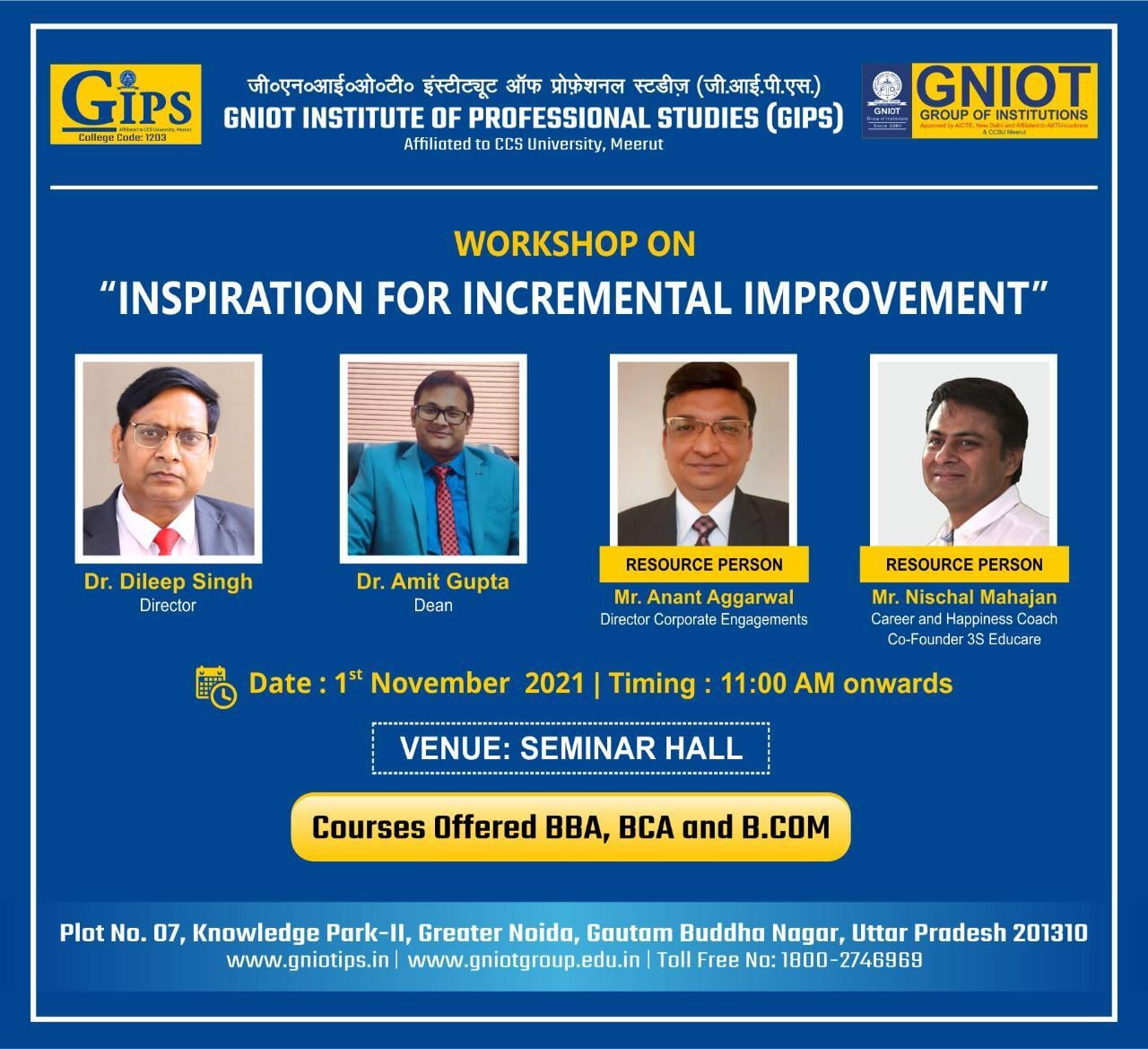 "The Biggest Room in the World is the Room for Improvement" GNIOT Institute of Professional Studies (GIPS) organizing an expert lecture on "Inspiration For Incremental Improvement" on 1st November, 2021 (Monday) at 11 am in seminar hall for BBA, BCA & B.Com students. Resource Persons : Mr. Anant Aggarwal (Director Corporate Engagements) Mr. Nischal Mahajan (Career & Happiness Coach Co- Founder 3s Educare) "Growth is the only evidence of life" Participate and get useful insights about continuity of strategic direction and continuous improvement.