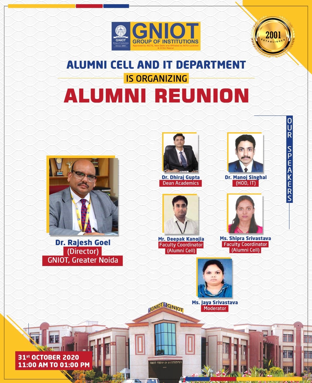 Department of Information Technology, GNIOT GROUP OF INSTITUTIONS, GREATER NOIDA, is organizing "Alumni Reunion” on 31st October, 2020 from 11:00 AM onwards.