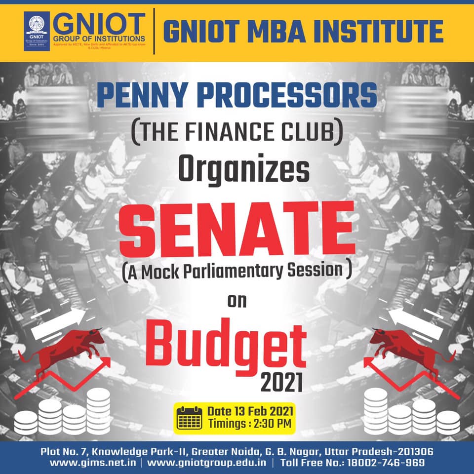 Penny Processors (The Finance Club) at GNIOT MBA Institute is organizing SENATE (A Mock Parliamentary Session) on Budget 2021.