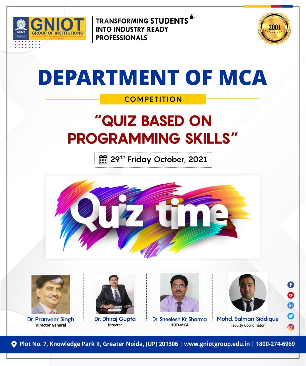 Department of Master of Computer Application (MCA) is organizing a Quiz based on programming skills on 29/10/2021. Quiz allows the students to think back to the information previously learned and enhance their knowledge, learn new things. A quiz is a quick and informal assessment of student knowledge. They help with concentration, identify gaps in knowledge, build confidence and help students to retain information.