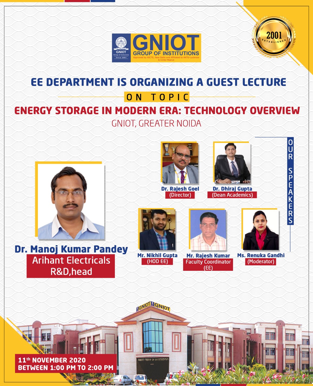 working as a R & D head at Arihant Electrical, New Delhi has total 21 years of experience including 9 years in the field of power electronic system design, electromechanical axial system & control & instrumentation of electron beam accelerators at Bhabha Atomic Research Center(BARC), Mumbai. presently worked on lithium ion batteries & it's associated electronics for EV as well as energy storage solution.Energy storage is the capture of energy produced at one time for use at a later time. Some technologies provide short term energy storage, while others can endure for much longer. Bulk energy storage is currently dominated by hydroelectric dams, both conventional as well as pumped.Grid energy storage is a collection of methods used for energy storage on a large scale within an electrical power grid. Candiates & faculties interested to join this guest lecture may kindly register through the link (https://forms.gle/6bmBUTK5MmrJb1ph9) at least 1hour before the scheduled time. Kindly Join using below mentioned link https://teams.microsoft.com/l/meetup-join/19%3a897ab87335214457a8c33b308613dad8%40thread.tacv2/1604906260913?context=%7b%22Tid%22%3a%22294b02b1-2ddc-4fb0-a751-a1ee654fd4c2%22%2c%22Oid%22%3a%22405dcc23-1a6a-4637-b22f-2893ff0ec0e3%22%7d