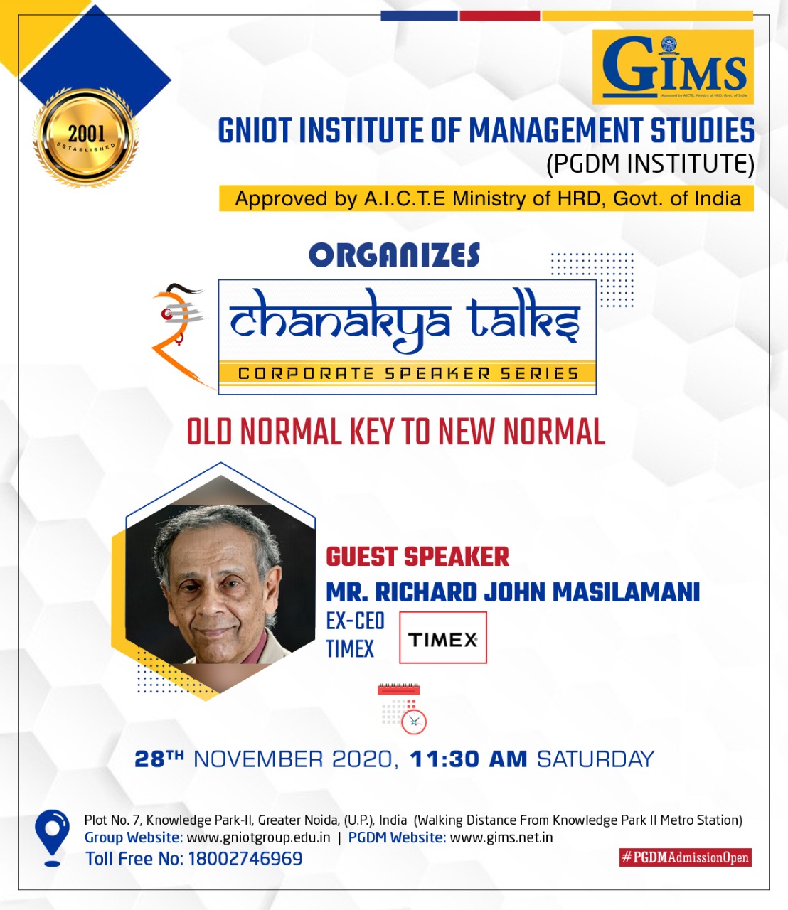 GNIOT Institute of Management Studies (GIMS), feel privileged to welcome Mr. Richard John Masilamani (Ex-CEO TIMEX), on 28th November' 20 as a Guest Speaker in 'Chanakya Talk Series'. It is a great opportunity for the students to get chance to interact with such seasoned strategist and gain new knowledge.
