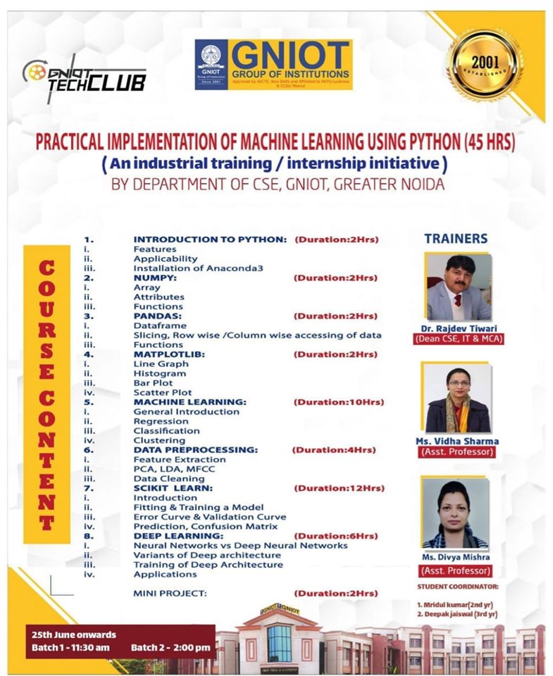 Department of Computer Science and Engineering with Techclub GNIOT is organising Hands on training on Machine Learning using Python (a 45 hrs program). Due to overwhelming response, multiple batches are formed. First two batches are starting on 25th June 2020.