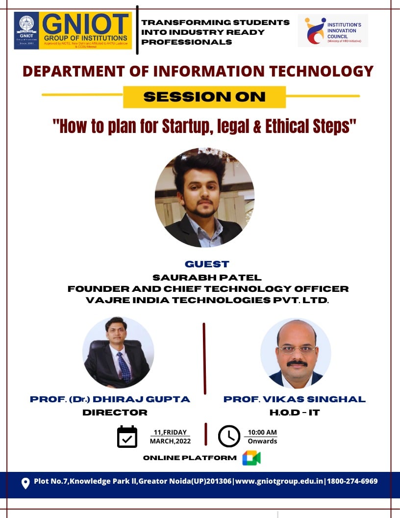 As a step forward Department of Information Technology is organizing a webinar on How to plan for Start-up and legal & Ethical Steps in association with Institute’s Innovation Council (IIC) on the 11th March,2022 from 10:00 am to 11:30 am.