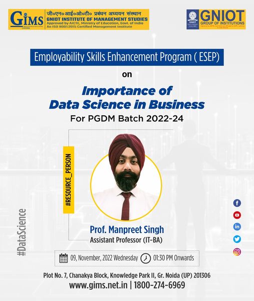 Data science has the potential to revolutionize the businesses. Under the banner of "Employability Skill Enhancement Program(ESEP)", on “Importance of Data Science in Business” is being organized for PGDM Batch 2022-24 on November 9, 2022.