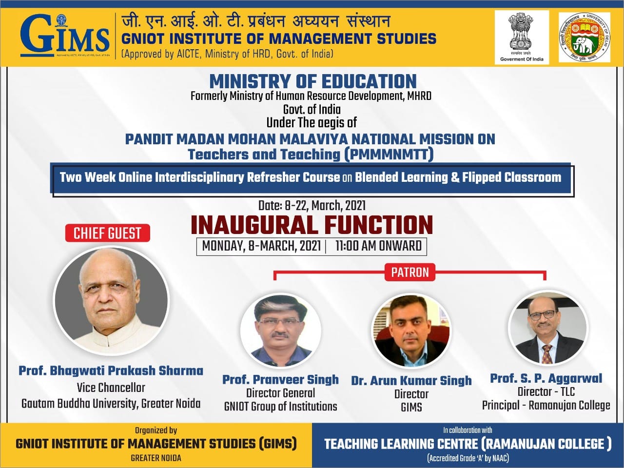 GNIOT Institute of Management Studies (GIMS), Greater Noida in association with Teaching Learning Centre ( Ramanujan College, University of Delhi) invites all to the Inaugural Function of the Two Week Interdisciplinary Refresher Course on Blended Learning & Flipped Classroom on March 8, 2021, 11:00AM onwards. The occasion will be graced by the propitious presence of Prof. Bhagawati Prakash Sharma, Hon. Vice-Chancellor, Gautam Buddha University. Dr. Pranveer Singh, Director General, GNIOT Group of Institutions, Greater Noida, Dr. Arun Kumar Singh, Director GIMS, Greater Noida and Prof. S. P. Aggarwal, Director- TLC, Principal - Ramanujan College, University of Delhi will be the patrons for the event.