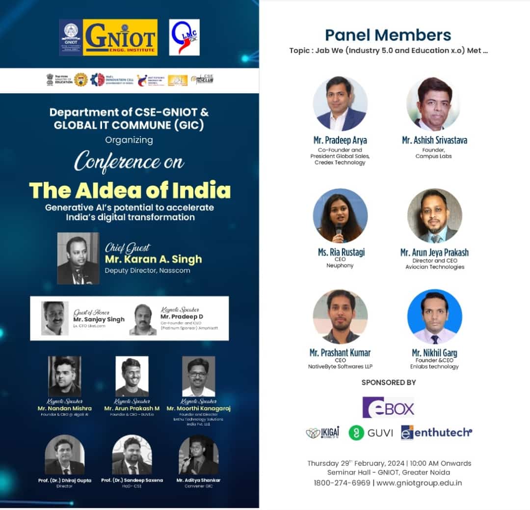 Department of Computer Science & Engineering,GNIOT in association with GLOBAL IT COMMUNE(GIC) is organizing conference on The AIdea of India : Generative AI's potential to accelerate India's digital transformation, on 29th February, 2024 at Seminar Hall, First Floor, GNIOT Main Building, Greater Noida.