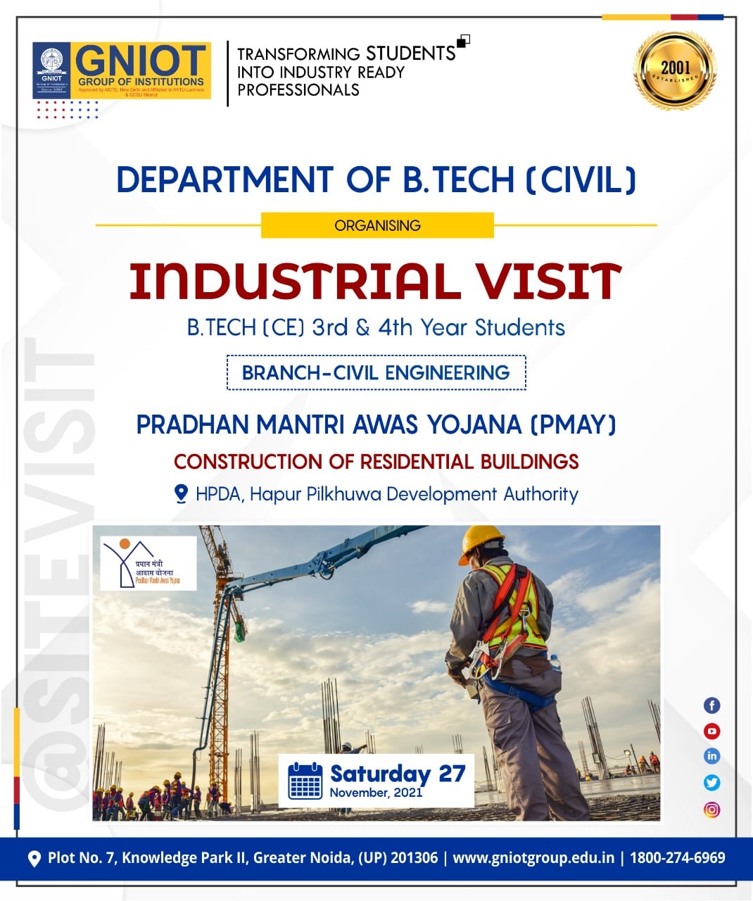 Civil Engineering Department is organizing an Industrial Site Visit to a Residential Housing Project under Pradhan Mantri Awas Yojna by Hapur-Pilkhuwa Development Authority for 4th and 3rd year students on 27th November 2021.