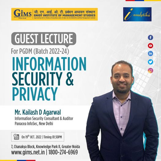GNIOT Institute of Management Studies, is organizing a GUEST LECTURE on “Information Security and Privacy” for PGDM Batch 2022-24 on 19th October 2022 (Wednesday) at 1.30 PM onwards.