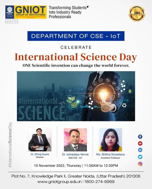 Department of CSE-IOT is celebrating International Science Day on 10th November. On this event students of IOT 2nd year and 3rd year will present documentary films on latest invention in science. The event timings are - 11:00 a.m. to 12:30 p.m.