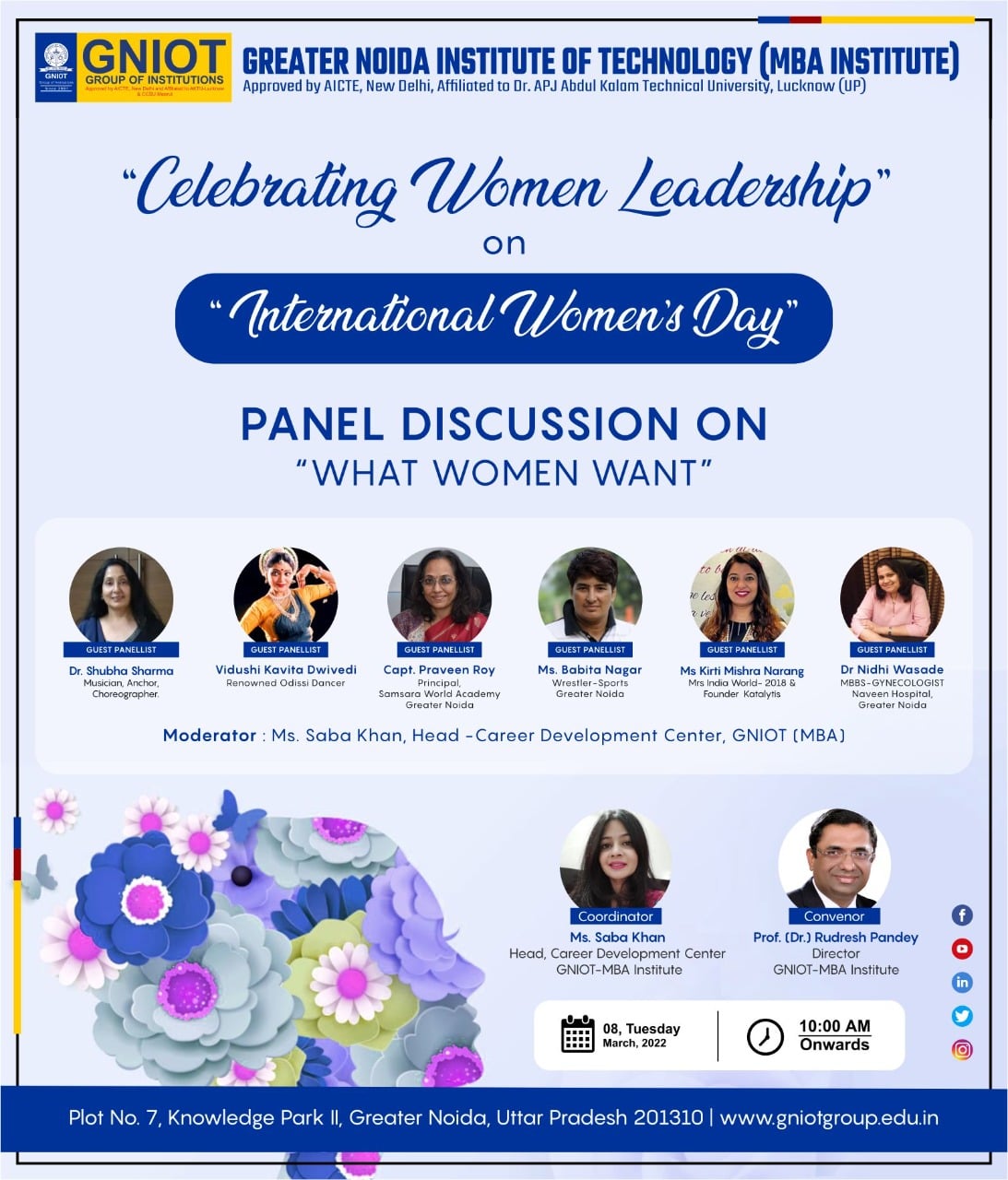 Greater Noida Institute of Technology (MBA Institute) is CELEBRATING WOMEN LEADERSHIP in which there will be a panel discussion on " WHAT WOMEN WANT " on International Women's Day, 8th March, 2022 (Tuesday) 10:00 Am onwards.