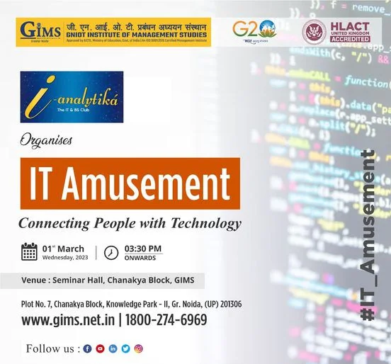 i-Analytica, the IT & BA Club of GIMS, Greater Noida is organizing first of its kind IT Amusement activities with an objective to create outlet for our students to express their ideas and explore their interests in the field of technology through Skits, Poems, Songs, and RAP performances on 1st, March 2023.