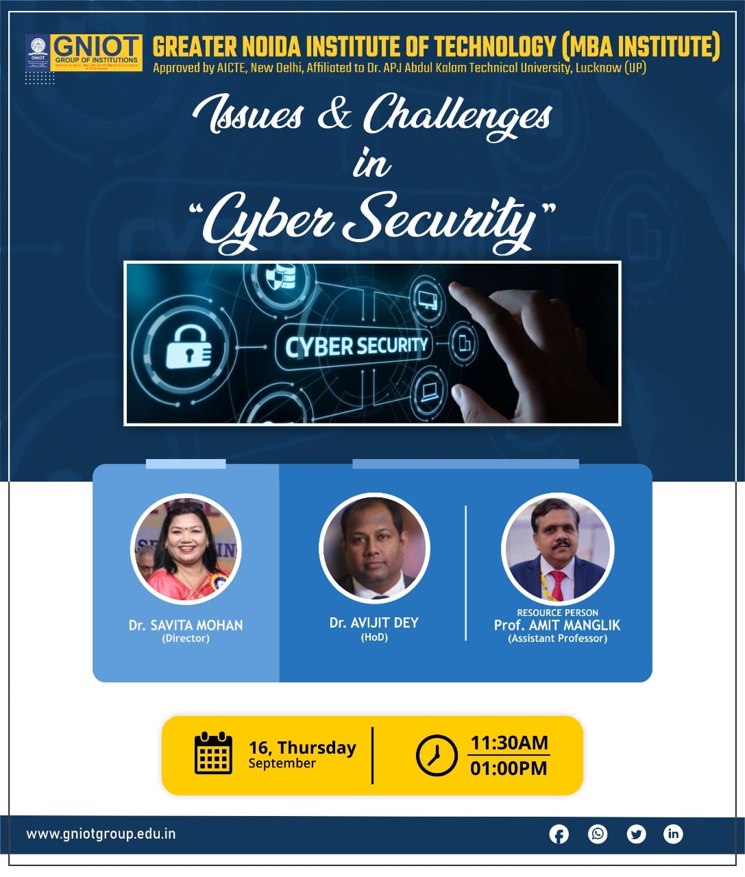 Greater Noida Institute of Technology – MBA Institute is organizing a lecture on “Issues and challenges in Cyber Security”. It’s objective is to make students aware about how to reduce the risk of cyber attacks and protect against the unauthorised exploitation of systems, networks and technologies.