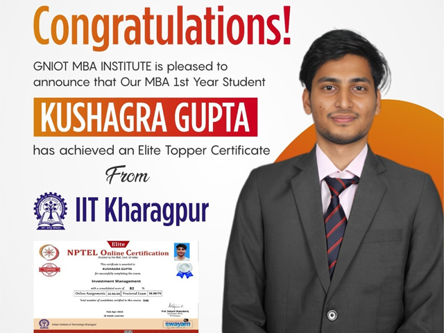 Congratulations! GNIOT MBA Institute is pleased to announce that our MBA 1st year student Kushagra Gupta has achieved an elite topper certificate Form IIT Kharagpur.