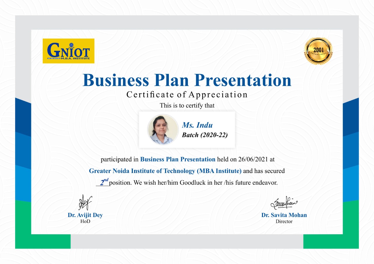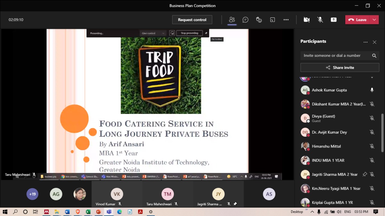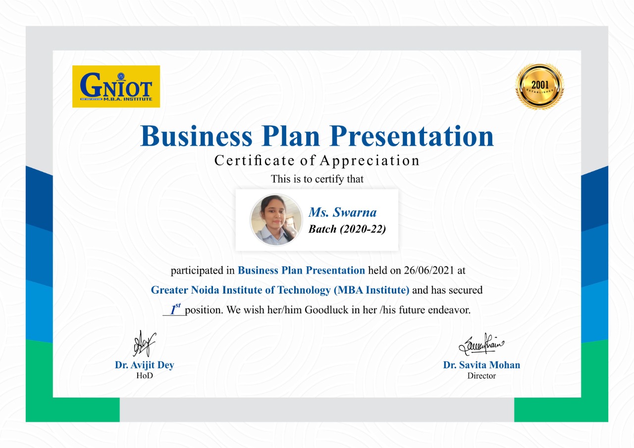 Without leaps of imagination or dreaming, we lose the excitement of possibilities. Dreaming, after all, is a form of planning. The long-term strategy for the business can be expressed as a mission statement and company values. To carry forward, GNIOT Group of Institutions (MBA Institute) has organized Business Plan Competition2021- "Creative Heads" on 26/6/2021 from 2:00 pm onwards. The objective of the competition is to identify the business objectives and statements that indicate what is critical in your organizational strategy and to develop a competitive spirit among students. The program is started with the welcome address by (Prof.)(Dr) Savita Mohan who has very well stated the importance of creative thinking, practical exposure, government subsidies, adapting volatility, and how to sustain in the market with the competitors and also praised the contributors of the event.