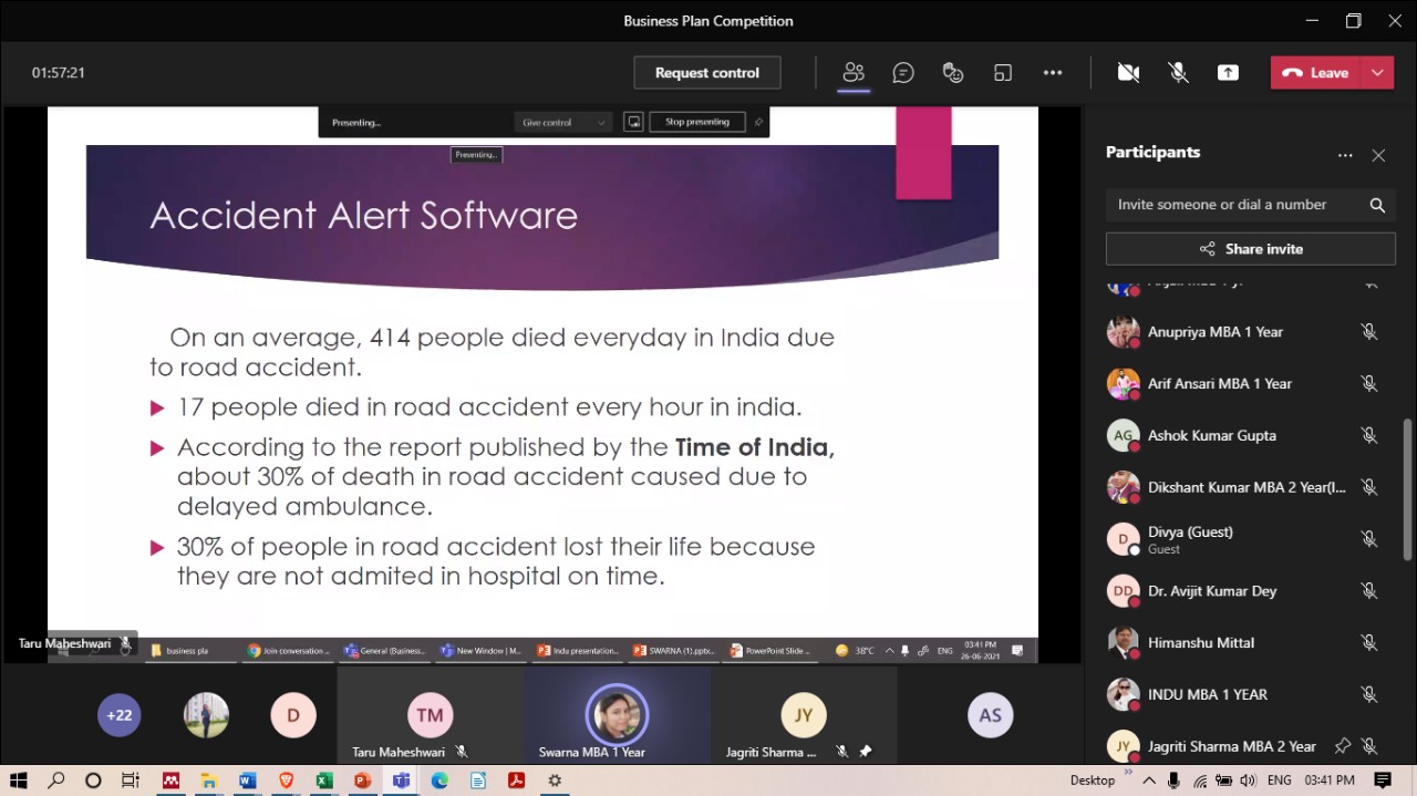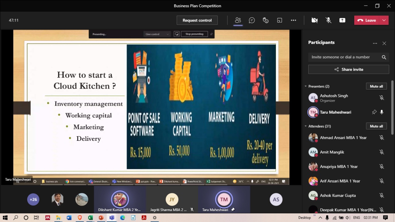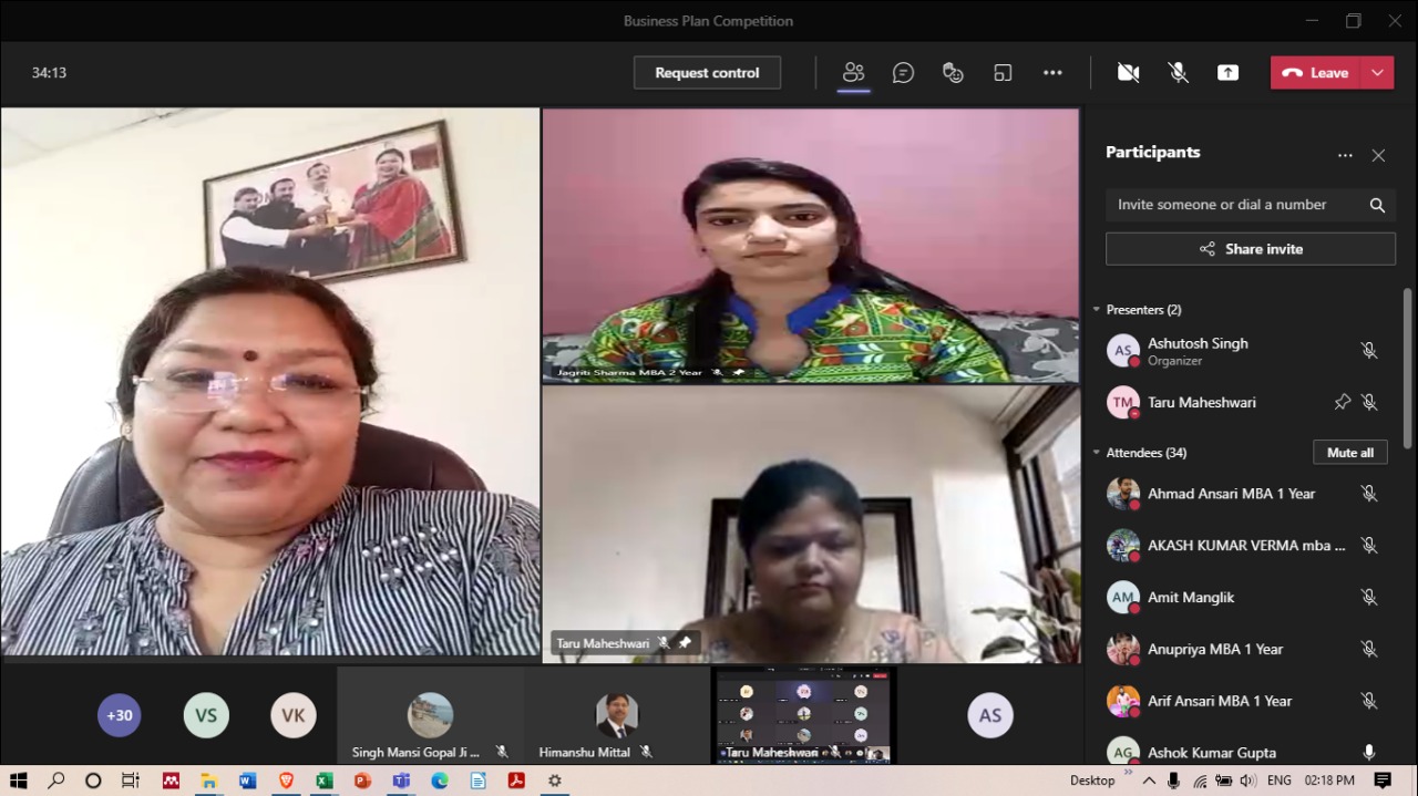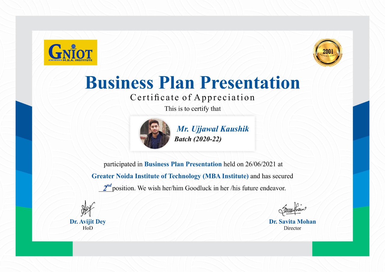 Without leaps of imagination or dreaming, we lose the excitement of possibilities. Dreaming, after all, is a form of planning. The long-term strategy for the business can be expressed as a mission statement and company values. To carry forward, GNIOT Group of Institutions (MBA Institute) has organized Business Plan Competition2021- "Creative Heads" on 26/6/2021 from 2:00 pm onwards. The objective of the competition is to identify the business objectives and statements that indicate what is critical in your organizational strategy and to develop a competitive spirit among students. The program is started with the welcome address by (Prof.)(Dr) Savita Mohan who has very well stated the importance of creative thinking, practical exposure, government subsidies, adapting volatility, and how to sustain in the market with the competitors and also praised the contributors of the event.