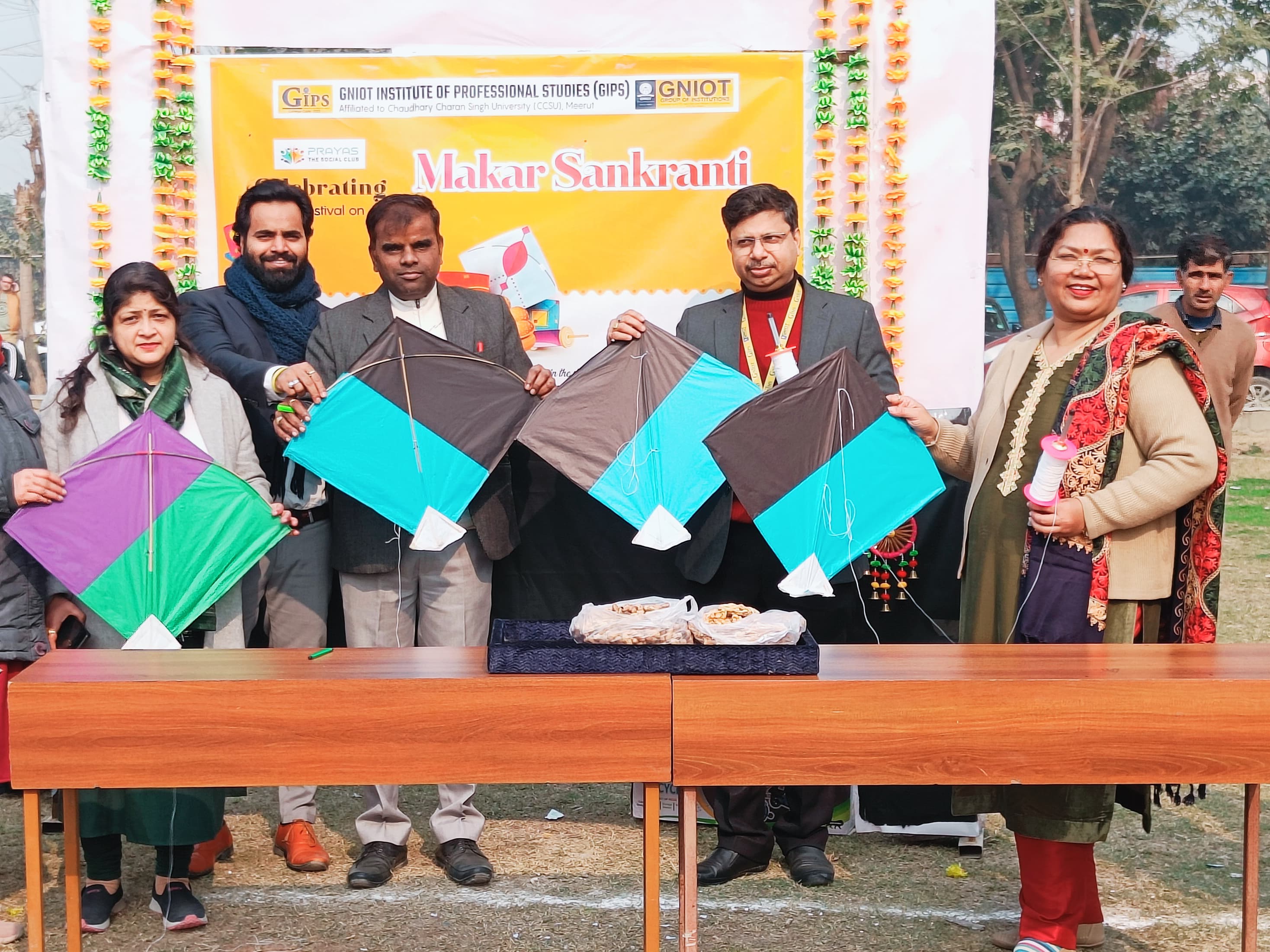 Celebrating the vibrant spirit of Makar Sankranti, PRAYAS- The Social Club of GNIOT Institute of Professional Studies hosted a spectacular Kite Festival that brought together students and faculty, with joy, color, and cultural fervor. It transformed the college campus into a lively arena where colorful kites adorned the sky, creating a mesmerizing spectacle. The festival not only showcased the rich tradition of kite flying associated with Makar Sankranti but also served as a platform for participants to showcase their creativity and kite-flying skills.