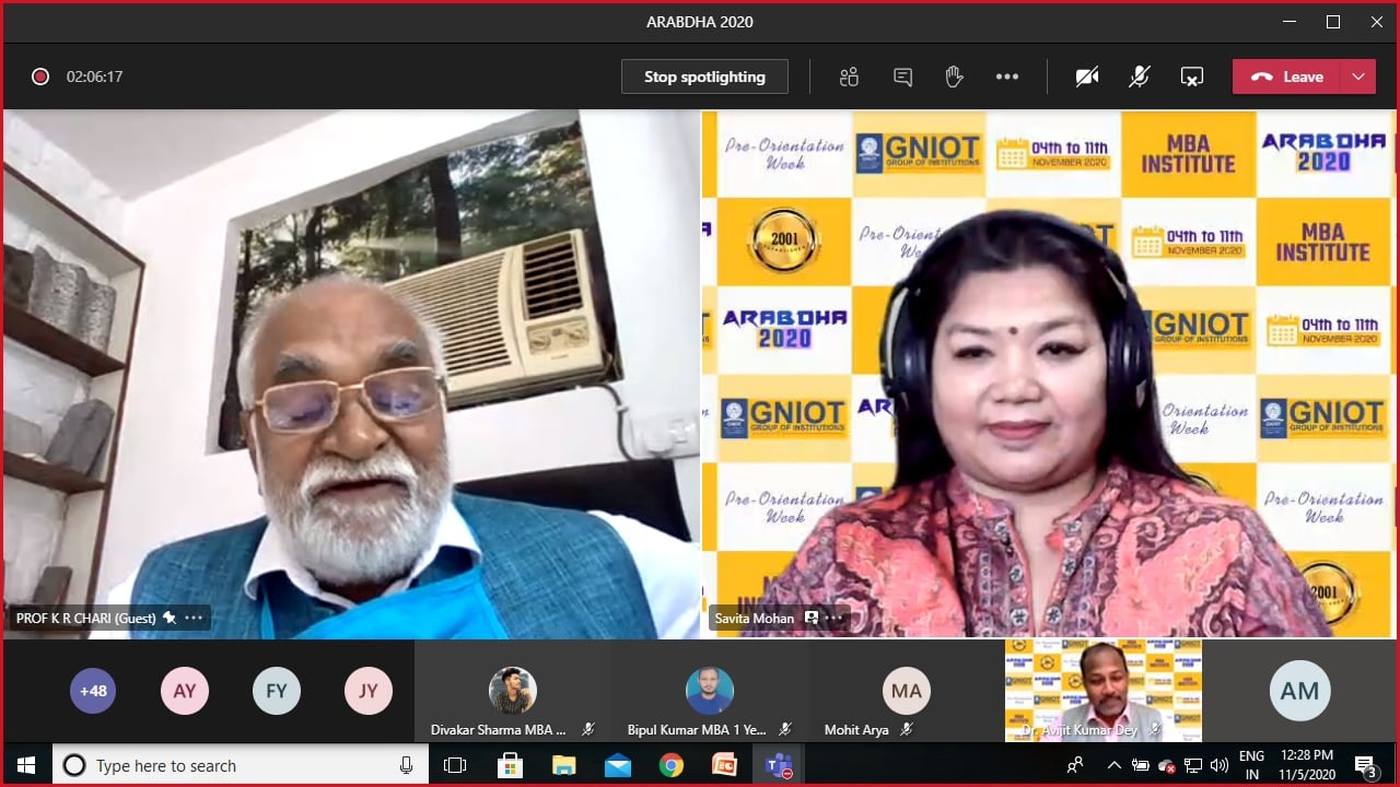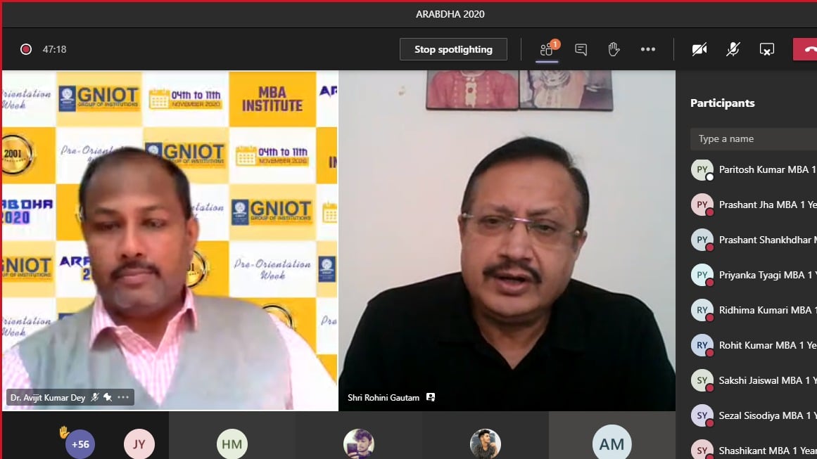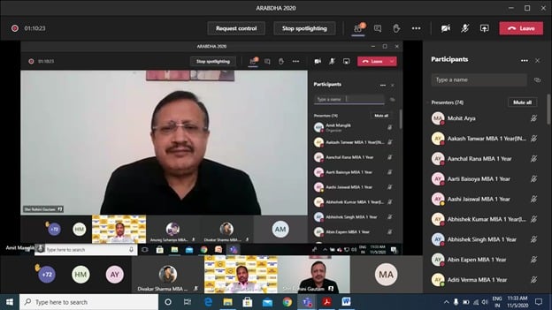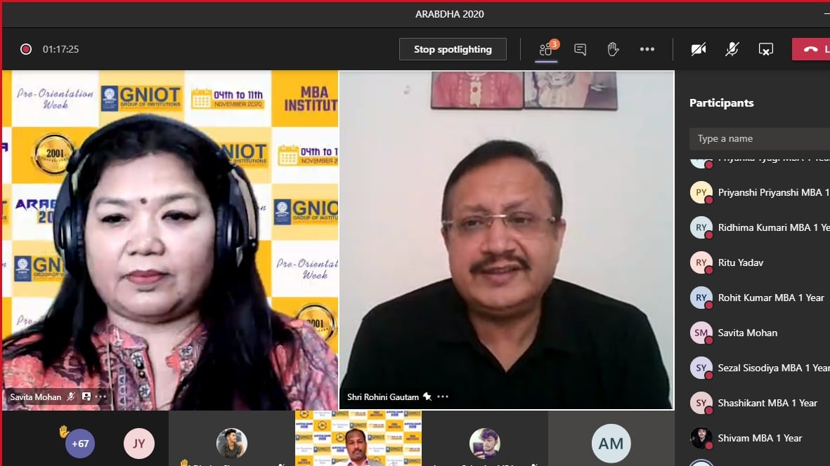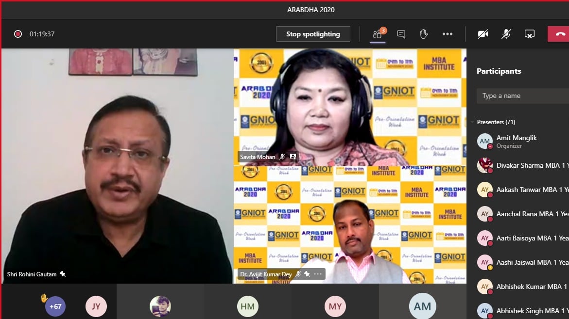 The second day of Orientation Programme ARABDHA -2020 started with a welcome note by Prof. Dr. Savita Mohan to our esteemed guest speaker Shri Rohini Gautam (Director in Military Service, Joint adviser-UIDAI). Mr. Gautam’s deliverance was focused on Career skills- career development tools and ideas. He asked students that where they want to go in their career, they have to decide now. He stated that deciding on a career takes research, goal setting and knowledge of self. You have to see the pros and cons of each and every sector. He emphasized on the fact that there is no short cut for success. Initially you must decide what you want to become. Students can go for career planning tools like SWOT Analysis, Career testing, self-assessment, personality test, Career planning test etc. Mr. Gautam affirmed that students have to use the available resources, explore their strength, build effective relationship and develop an ability to deal with career challenges and difficult people.