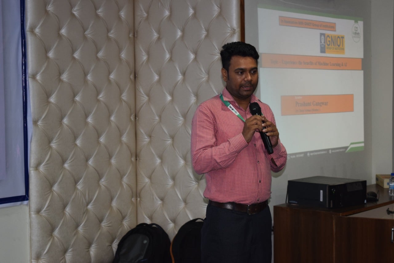 The learned resource person of the event was Mr. Prashant GangwarSenior Consultant, UpBrain Skill Solution, New Delhi. Mr. Prashant Gangwar stressed on pivotal role of Artificial Intelligence & Machine Learning are playing in our day to day. He provided insights that presently Artificial Intelligence and Machine Learning are a part of fifth generation of computer programming language. He threw light on concepts like Heuristics, NLP, Knowledge Representation, and Automated Reasoning. AI and Machine He deliberated that today we are using this technology in Voice Recognition, Image Processing, Computer Vision, Robotics etc.